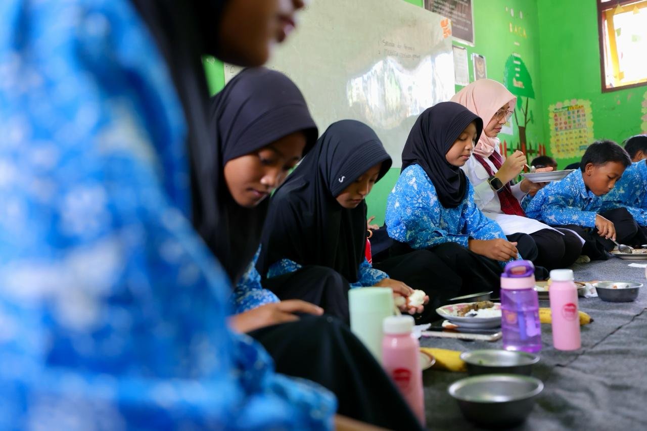 Ipuk tidak hanya meninjau posyandu lansia, tetapi juga menyempatkan diri untuk sarapan bersama siswa-siswa SD di SDN 3 Telemung sebagai bagian dari kampanye hidup sehat.