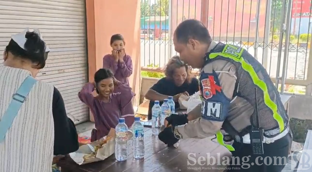 Banyuwangi, seblang.com – Personel Satlantas Polresta Banyuwangi mengimbau pengendara untuk beristirahat sekaligus membagikan makan siang di tengah kepadatan arus lalu lintas menuju Pelabuhan ASDP Ketapang, Kamis (2/4/2026).