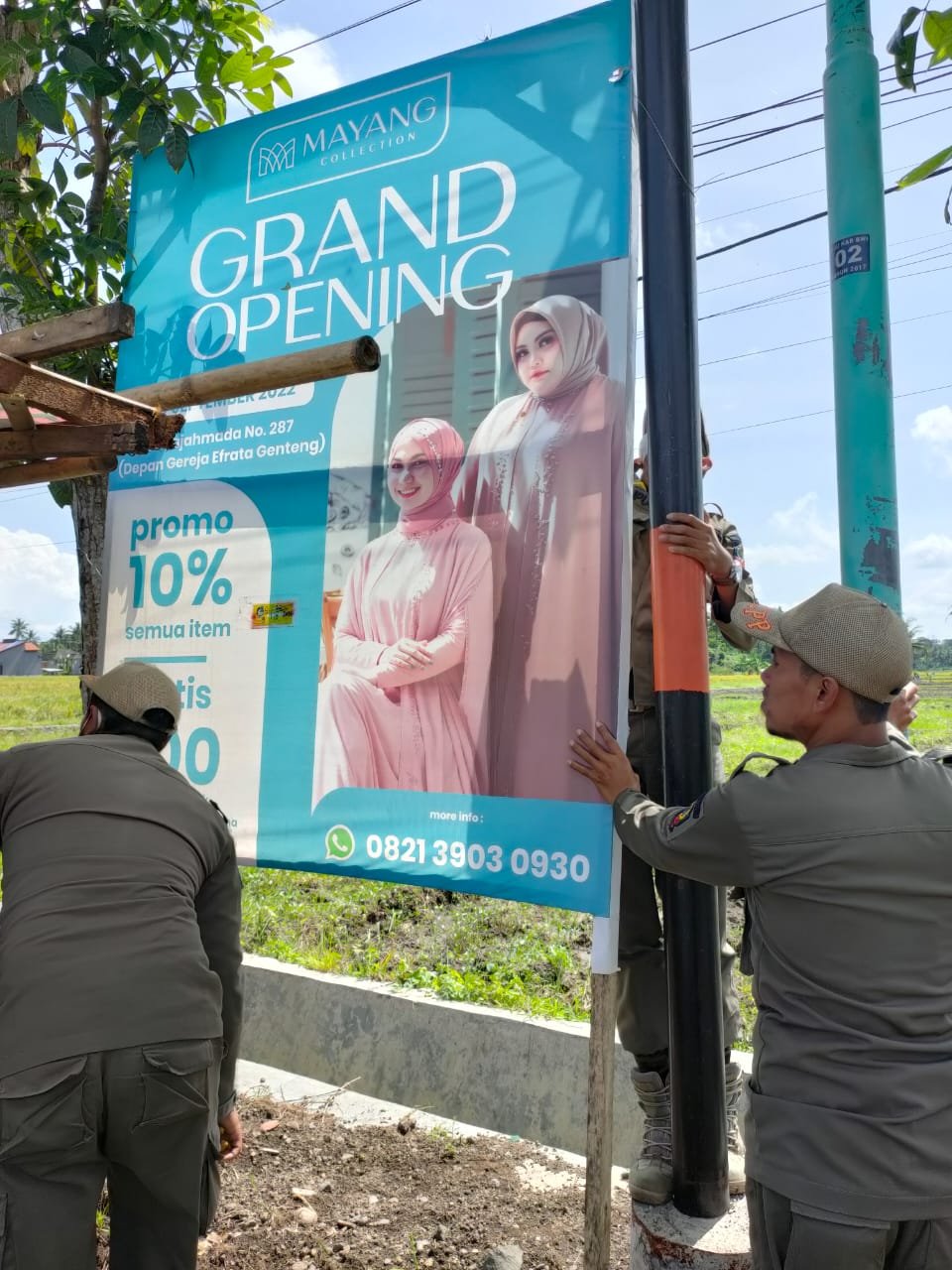 Banyuwangi, seblang.com – Anggota Satpol PP Kecamatan Genteng, Banyuwangi, mencopot paksa banner reklame berukuran besar dan kecil yang telah habis masa izin di perbatasan Kecamatan Genteng dan Sempu. Tepatnya jembatan patung ular dan depan SPBU Tegalyasan, Senin (24/10/22).