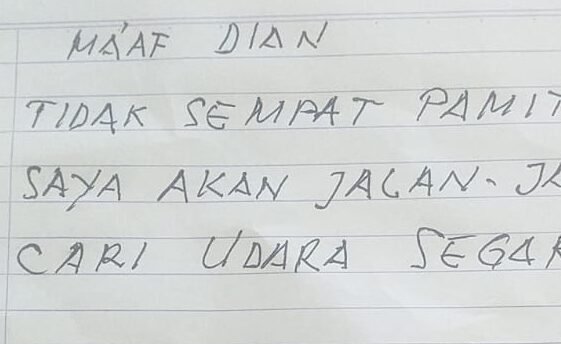 Sebelum kejadian, kata Kusmin, korban sempat meninggalkan surat kepada anaknya berisi pesan “Maaf Dian, tidak sempat pamit, Saya akan jalan-jalan mencari udara segar”.