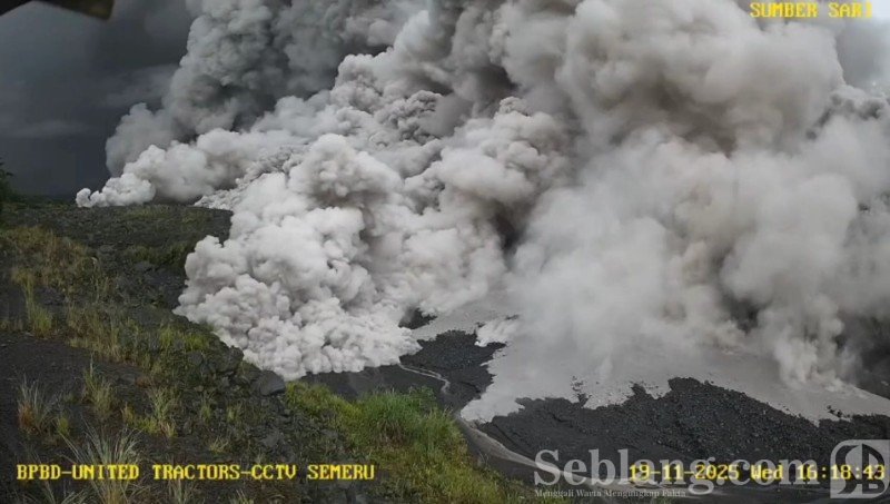Lumajang, seblang.com – Gunung Semeru kembali menunjukkan peningkatan aktivitas signifikan pada Rabu (19/11/2025) sore setelah memuntahkan kolom abu setinggi sekitar 2.000 meter dari puncak. Abu kelabu berintensitas tebal itu terbawa angin ke arah utara dan barat laut, disertai awan panas guguran yang telah meluncur sejauh 7 kilometer dari kawah.