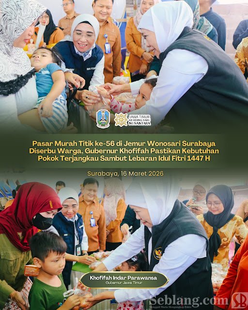 Surabaya, seblang.com – Menjelang Idulfitri 1447 Hijriah, Gubernur Jawa Timur Khofifah Indar Parawansa menggencarkan pelaksanaan pasar murah guna membantu masyarakat memperoleh bahan kebutuhan pokok dengan harga terjangkau sekaligus menjaga stabilitas harga di pasaran.