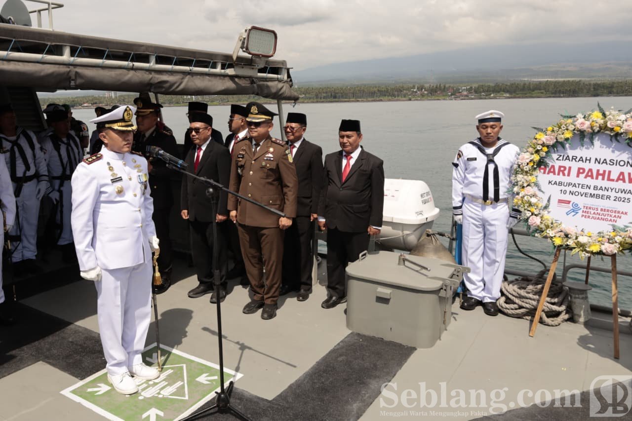 Banyuwangi, seblang.com – Peringatan Hari Pahlawan di Banyuwangi diisi dengan upacara tabur bunga di Selat Bali menggunakan Kapal Angkatan Laut (KAL) Sembulungan II-5-42, Senin (10/11/2025). Upacara dipimpin Danlanal Banyuwangi Letkol Laut (P) Muhamad Puji Santoso dan diikuti jajaran Forkopimda serta perwakilan veteran.