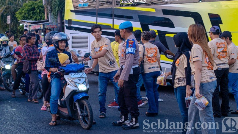 Banyuwangi, seblang.com – Komunitas Musisi dan Singer Banyuwangi (KMSB) menggelar kegiatan sosial berbagi takjil kepada para pengguna jalan di depan Pelabuhan ASDP Ketapang, Banyuwangi, Sabtu (14/3/2026). Kegiatan ini menjadi bentuk kepedulian para insan seni kepada masyarakat sekaligus momentum mempererat silaturahmi antar musisi dan komunitas seni di Banyuwangi.