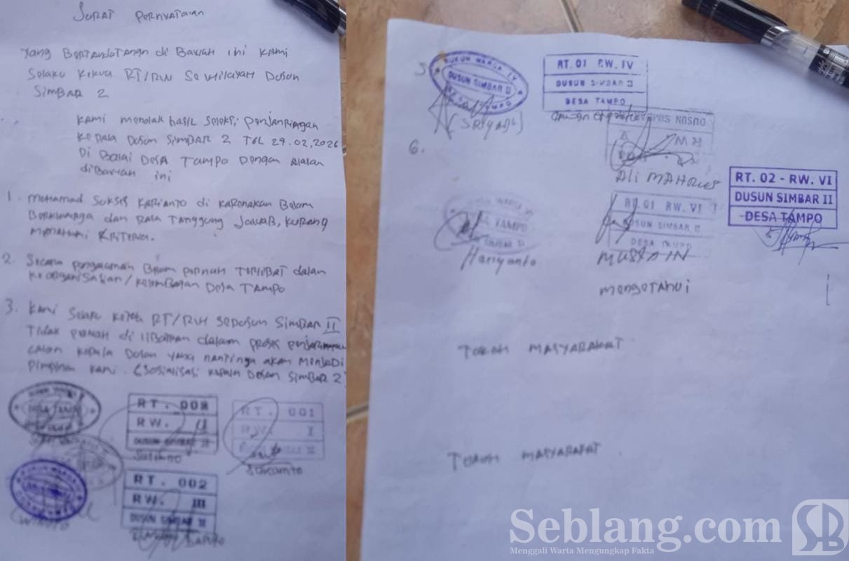 Penolakan tersebut dituangkan dalam sebuah surat pernyataan yang berisi penolakan terhadap hasil seleksi penjaringan yang digelar panitia pada 28 Februari 2026 di balai kantor desa setempat. Pada poin ketiga surat tersebut disebutkan bahwa RT dan RW se-Dusun Simbar II tidak pernah dilibatkan dalam proses penjaringan kepala dusun.