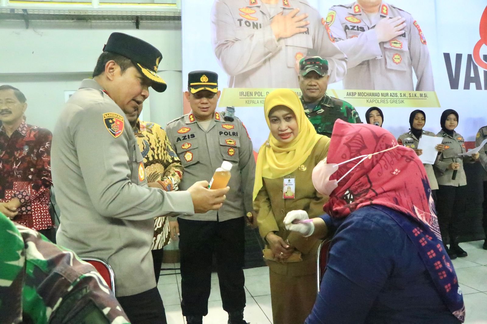 Dalam rangka meningkatkan imunitas guna pencegahan penyebaran covid-19, Kapolda Jatim Irjen Pol Toni Harmanto bersama Forkopimda Jatim melakukan penyaluran vaksinasi kepada masyarakat Jawa Timur, seperti yang dilakukan di Kabupaten Gresik ini.