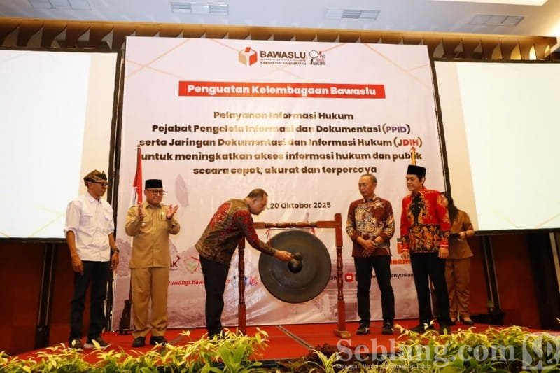 Banyuwangi, seblang.com – Wakil Bupati Banyuwangi, Mujiono, meminta Badan Pengawas Pemilu (Bawaslu) Kabupaten Banyuwangi untuk terus meningkatkan keterbukaan informasi publik dalam penyelenggaraan pemilu. Hal itu disampaikan saat membuka Rapat Koordinasi (Rakor) Penguatan Kelembagaan Pelayanan Informasi Hukum Bawaslu Banyuwangi di el Hotel, Senin (20/10/2025).