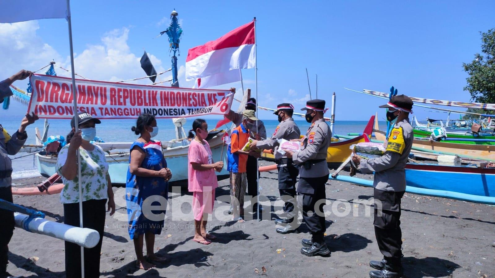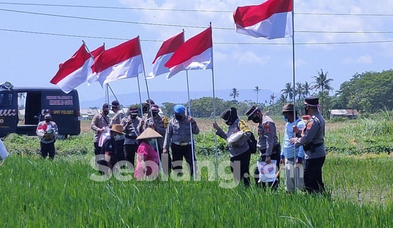 Selain bagikan bendera merah putih, polisi di Banyuwangi juga membagikan Baksos kepada masyarakat terdampak Covid-19. Diantaranya para nelayan di kawasan pesisir pantai dan para buruh tani yang tengah sibuk bercocok tanam di persawahan.