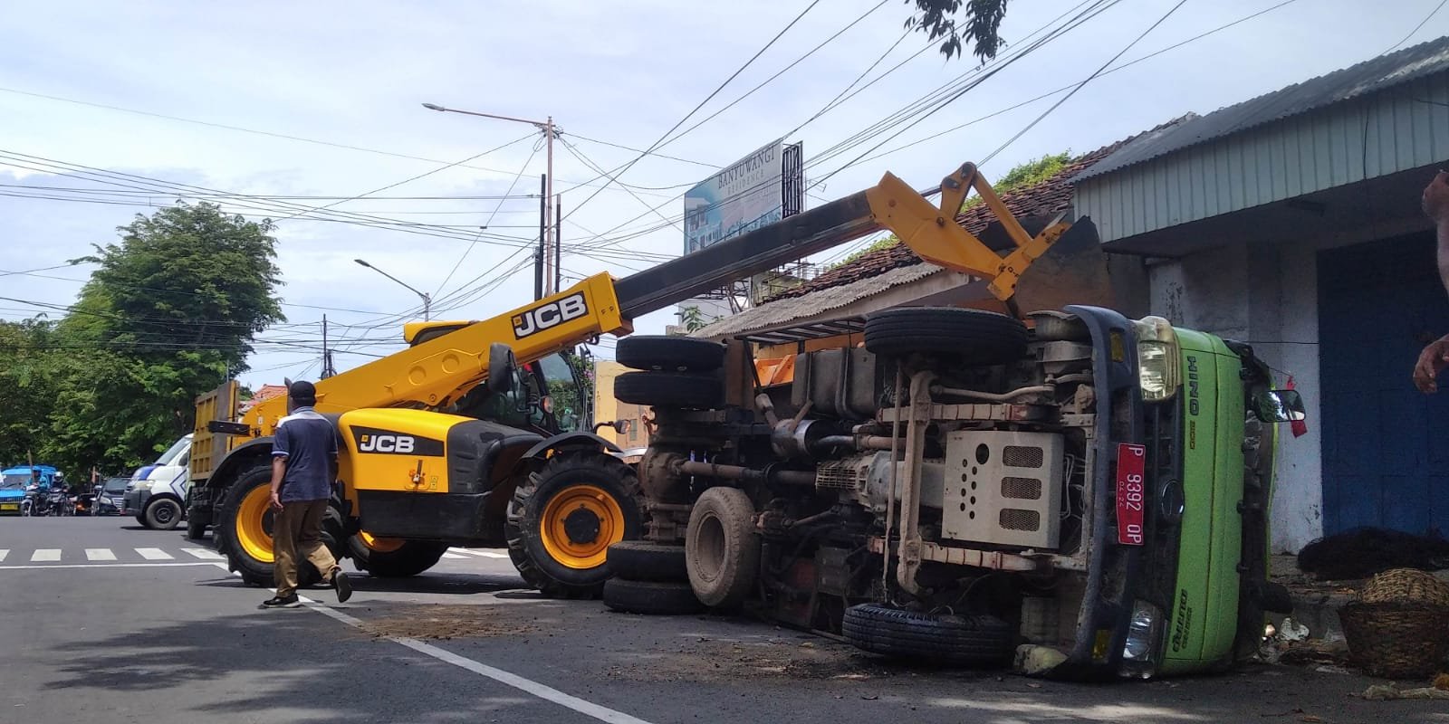 Banyuwangi, seblang.com – Bertepatan dengan penilaian Adipura di Kabupaten Banyuwangi, satu truk bermuatan sampah terguling di jalan MH Thamrin tepatnya di perempatan trafic light lateng.
