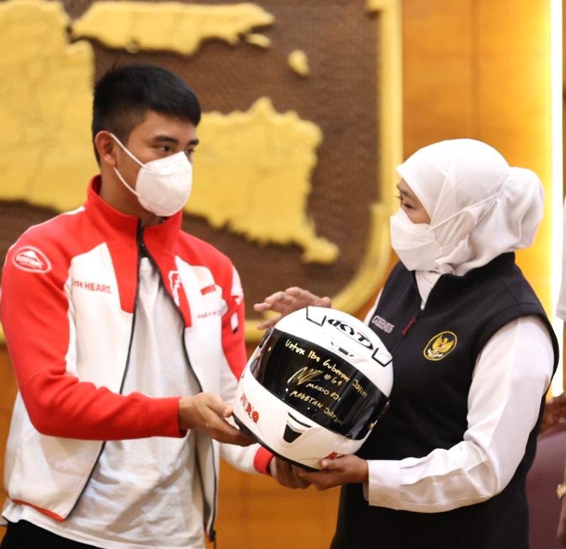 Harapan tersebut disampaikan Khofifah saat menerima kunjungan Pembalap Muda Andalan Indonesia Mario Suryo Aji, di Gedung Negara Grahadi Surabaya, Rabu (1/12) sore. Mario, panggilan akrab pembalap muda kelahiran Magetan, Jawa Timur tersebut akan tampil di Moto3 Tahun 2022 selama semusim penuh usai direkrut oleh Honda Team Asia.
