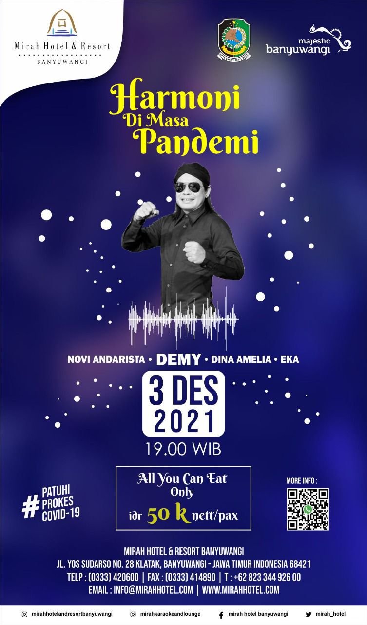 “Jangan lewatkan untuk dapat menyaksikan parade aksi seniman bumi blambangan sambil dinner bersama keluarga dan sahabat di Mirah Hotel and Resort Banyuwangi, pada Jumat (3/12) besok, mulai pukul 19.00 – 21.00 WIB,” kata Robby Abthoni, Rabu (1/12/2021).