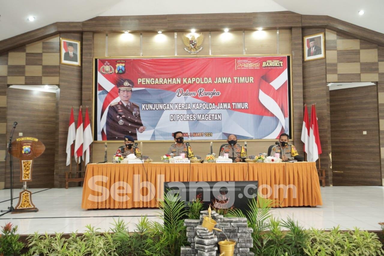 Magetan, seblang.com Kapolda Jawa Timur Irjen Pol Nico Afinta, bersama Pejabat Utama Polda Jatim, berikan pengarahan tentang program Kerja Kapolri dan Implementasi Tugas Wewenang dan Tanggung Jawab (TWT), serta penanggulangan Covid-19, di Aula Pesat Gatra, Polres Magetan, pada Rabu (3/3/2021).