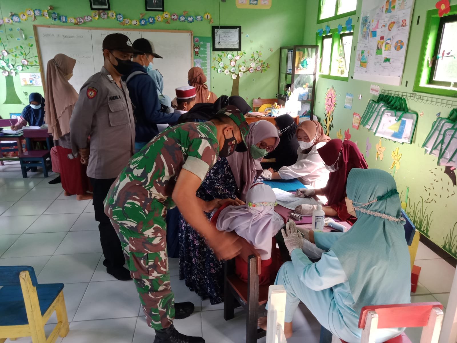 Blitar, seblang.com – Bhabinkamtibmas Desa Gembongan Bripka Andri S.B. dari Polsek Ponggok, bersama Babinsa Koramil Ponggok melakukan monitoring dan pengamanan kegiatan Vaksinasi kepada anak anak murid di MI Darusalam Ds. Gembongan kecamatan Ponggok kabupaten Blitar Jawa Timur Senin (24/01/2022) pagi.