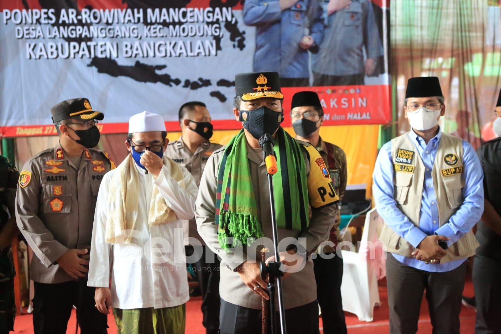Untuk Jawa Timur, vaksinasi berlangsung di Pondok Pesantren (Ponpes) Ar-Rowiyah Macingan, Desa Langpanggang, Kecamatan Modung, Kabupaten Bangkalan, yang diikuti Kapolri Jenderal Listyo Sigit Prabowo secara Virtual.