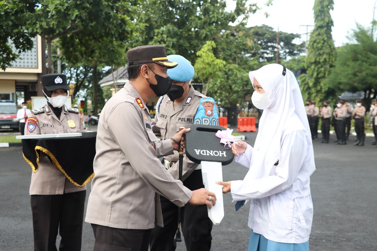 Kapolres Sampang secara simbolis menyerahkan kunci sepeda motor kepada Nafisa pelajar SMU Negeri 1 Torjun, Kursiyah alamat Dusun Duko Desa Tambelangan Kecamatan Tambelangan dan Marhadin warga Dusun Careccet Desa Tobai Tengah Kecamatan Sokobanah Sampang yang mendapatkan masing-masing sepeda motor baru honda Revo Fit.