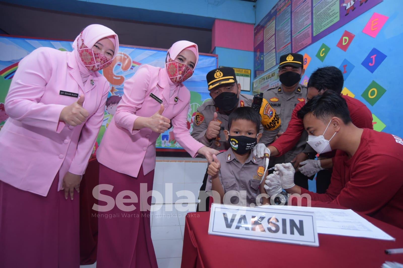 Banyuwangi, seblang.com – Kapolresta Banyuwangi AKBP Nasrun Pasaribu dan Ketua Yayasan Kemala Bhayangkari Cabang Kota Banyuwangi Ny. Neni Nasrun Pasaribu meninjau pelaksanaan vaksinasi Covid-19 khusus anak di TK Kemala Bhayangkari Polsek Rogojampi, Rabu (29/12/2021).