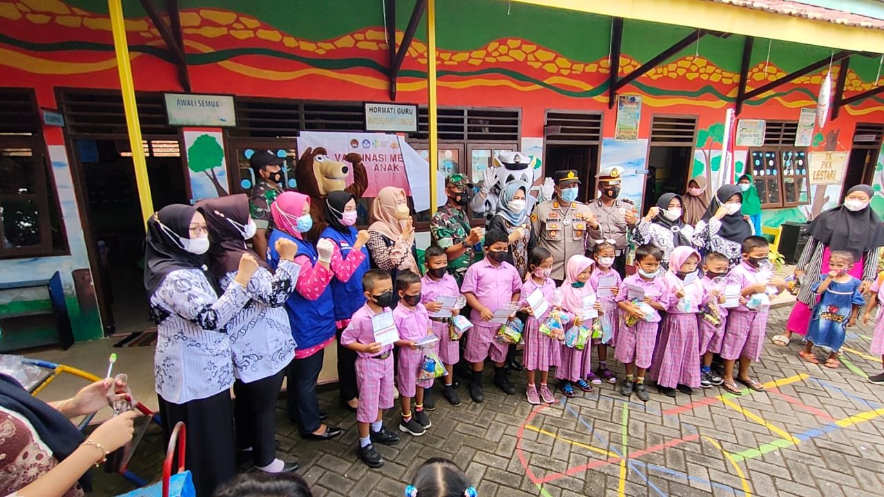 Para badut itu, mengantarkan siswa TK yang sudah berusia 6 tahun untuk antri divaksin dosis pertama.