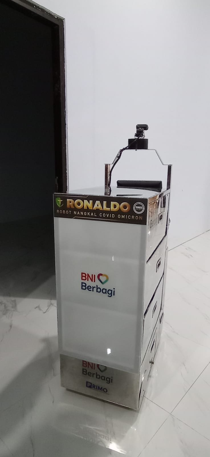 Mesin robot dengan nama Ronaldo (Robot Nangkal Covid Omicron) itu, memiliki tinggi 1,5 meter dilengkapi dengan empat rak secara bersusun yang bisa membawa banyak barang maksimal 50 kilogram.