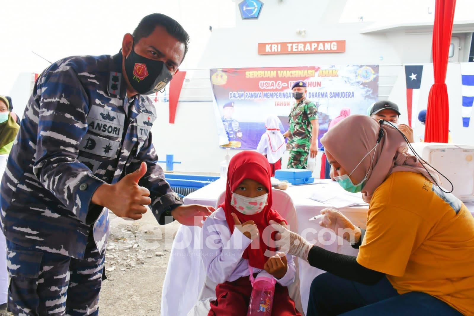 Banyuwangi, seblang.com – Pangkalan TNI AL (Lanal) Banyuwangi menggelar Serbuan Vaksinasi Anak Usia 6 – 11 tahun di Dermaga PT. Sumitama Intinusa Jl. Raya Situbondo, Kelurahan Ketapang, Kecamatan Kalipuro, Kabupaten Banyuwangi, Jawa Timur, atau tempat bersandarnya KRI Terapang-648, Senin (17/01/2020). Kegiatan tersebut merupakan rangkaian memperingati Hari Dharma Samudera Tahun 2022.