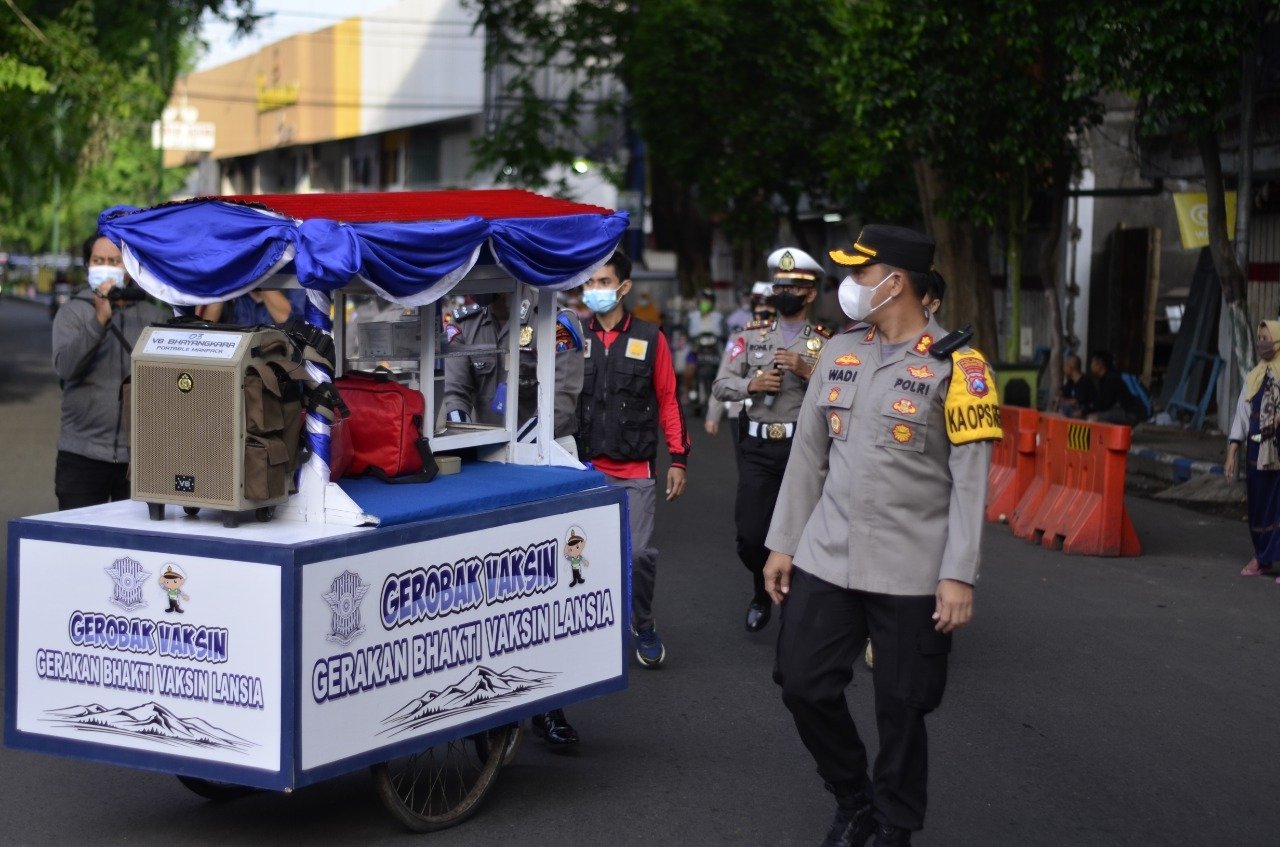 Gerobak vaksin itu dibawa langsung ke pasar tradisional. Sementara polisi yang bertugas, termasuk Kapolres, menjemput pedagang dan pembeli lansia di pasar untuk ikut vaksin.