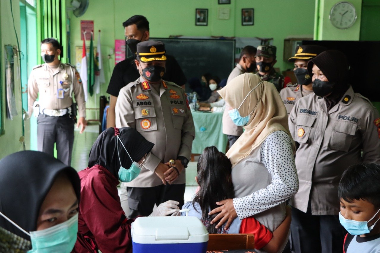 Blitar, seblang.com – Kapolres Blitar Kota, AKBP Argowiyono SH SIK MSi didampingi Wakapolres Blitar Kota Kompol Eusebia dan Kapolsek Kepanjenkidul Kompol Lahuri mengecek pelaksanaan vaksinasi Merdeka Anak di SDN Bendo 2 Kota Blitar, Jumat (15/1/2022) kemarin.