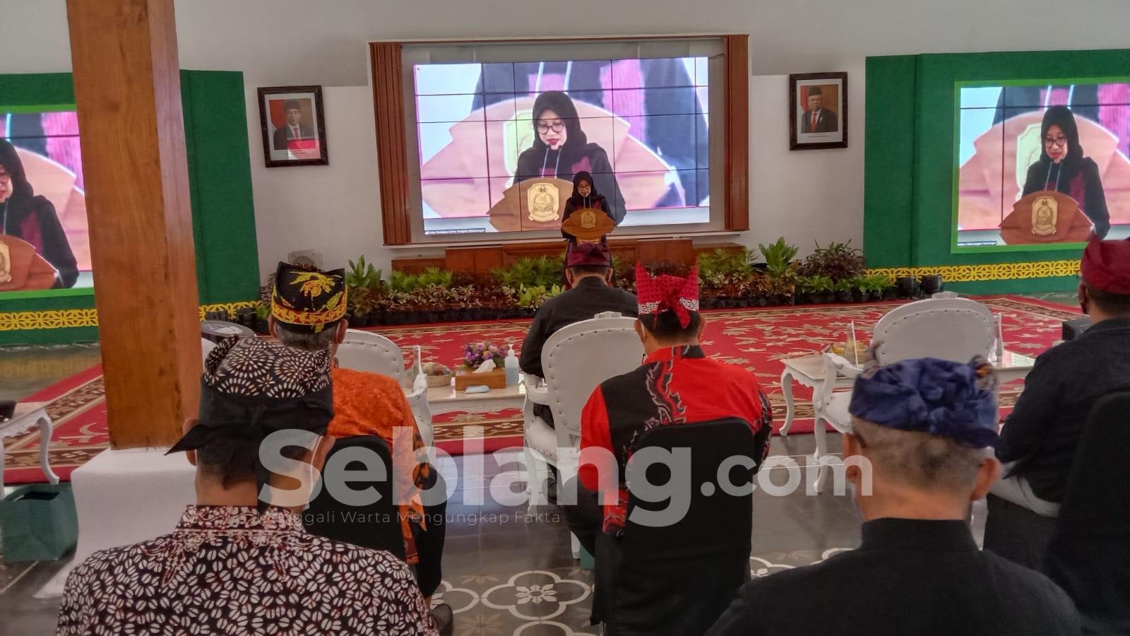 Banyuwangi, seblang.com – Bupati Banyuwangi Ipuk Fiestiandani mengajak masyarakat Banyuwangi bangga pada daerah dan selalu optimistis dalam menyongsong masa depan pada acara Spectacular Virtual Concert Gandrung Sewu Nusantara Tahun 2021 di Pendapa Sabha Swagatha Blambangan Banyuwangi Selasa (28/12/2021).
