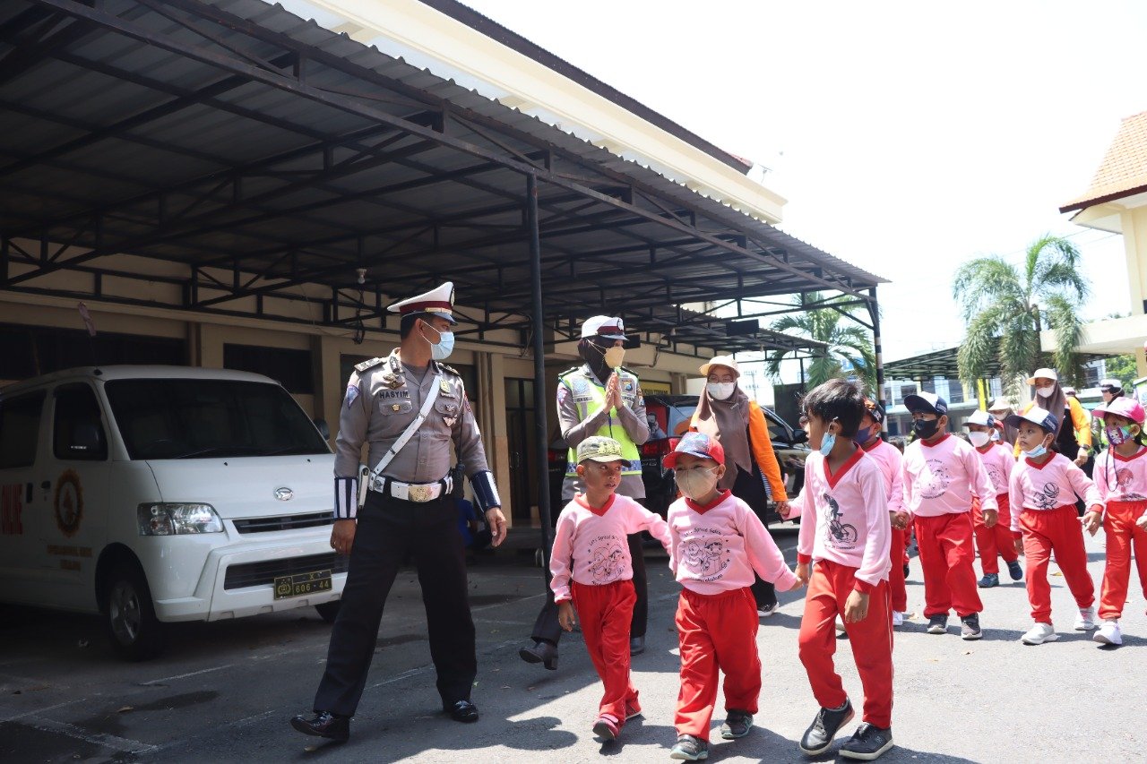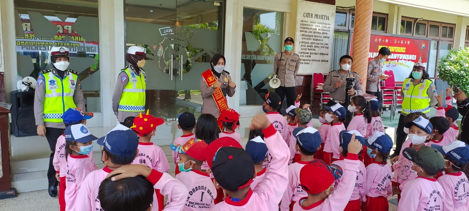 Banyuwangi, seblang.com – Unit Keamanan dan Keselamatan Satlantas Polresta Banyuwangi bersama anggota Satuan Pembinaan Masyarakat (Sat Binmas ) menerima kunjungan dari Taman Kanak-kanak Dharma Wanita 84 Rejoagung-Srono di halaman Mapolresta Banyuwangi Jawa Timur.