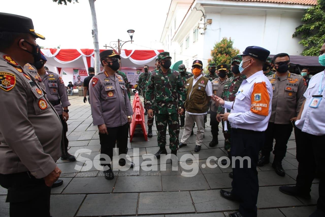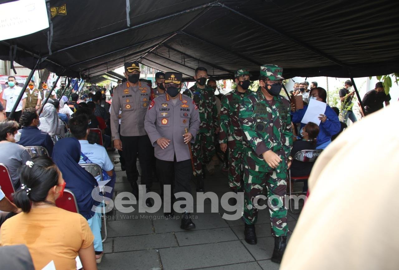 Jakarta, seblang.com – Panglima TNI Marsekal Hadi Tjahjanto dan Kapolri Jenderal Listyo Sigit Prabowo meninjau vaksinasi massal di Kota Tua, Jakarta Barat. Kegiatan vaksinasi massal ini diselenggarakan Polsek Metro Tamansari bekerjasama dengan Koramil 01 Tamansari sejak tanggal 5 hingga 9 Juli 2021.