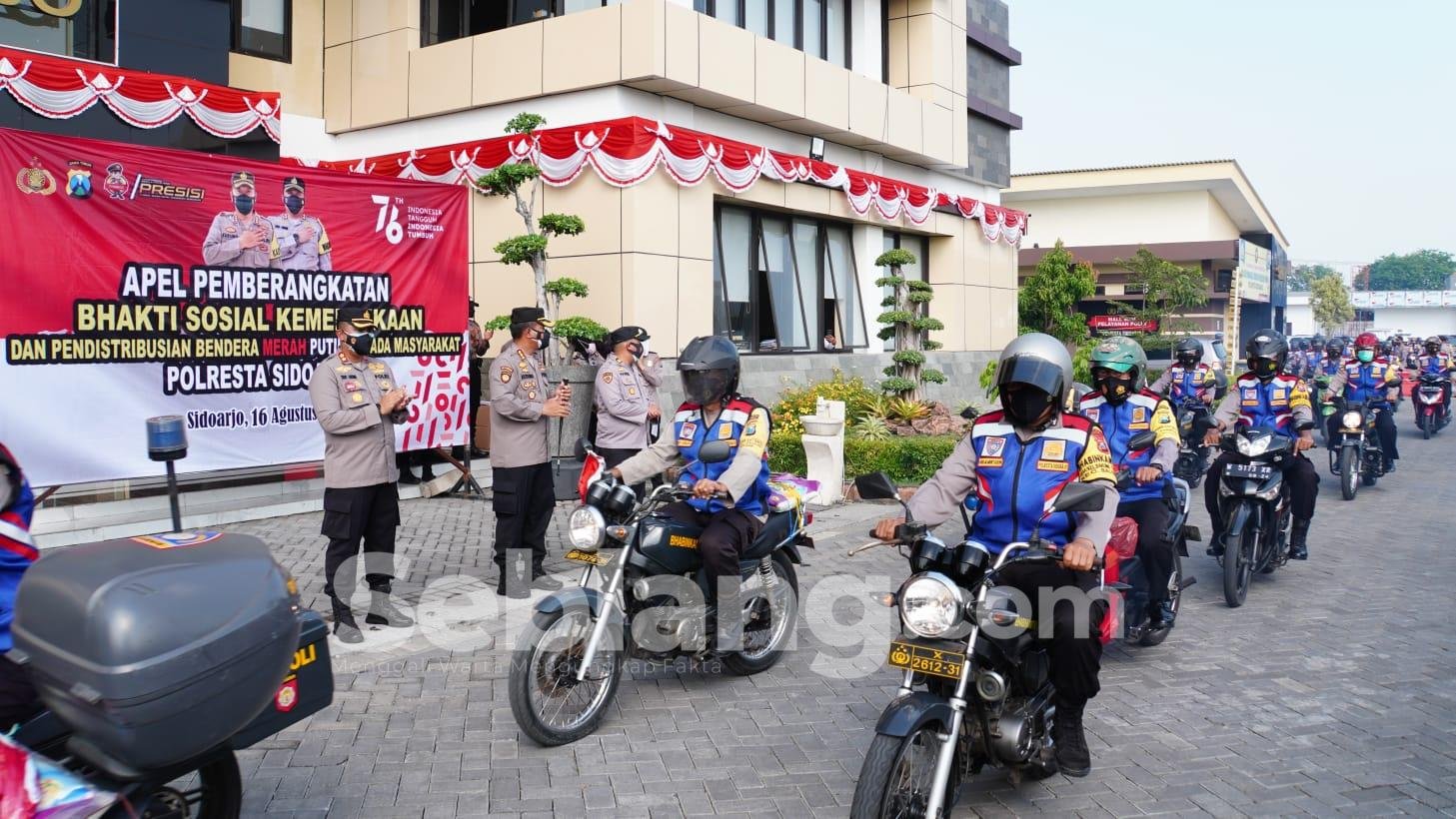 Pemberangkatan bhabinkamtibmas untuk mendistribusikan 5.000 bendera merah putih dan baksos bagi warga terdampak pandemi Covid-19 dalam rangka Dirgahayu Republik Indonesia ke-76, dilakukan di Mapolresta Sidoarjo, Senin (16/8/2021) oleh Kapolresta Sidoarjo Kombes Pol. Kusumo Wahyu Bintoro.