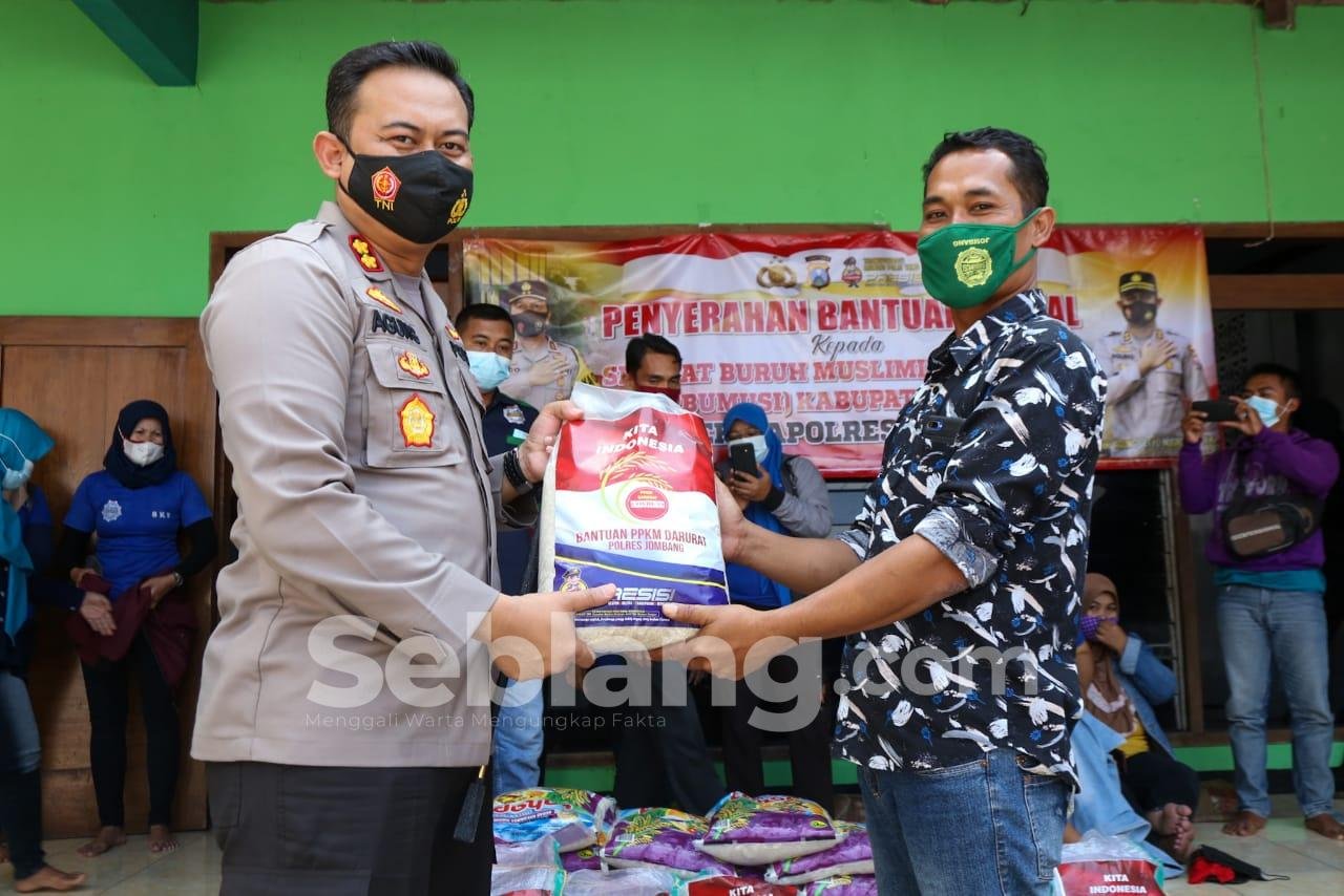 Jombang, seblang.com – Kapolres Jombang AKBP Agung Setyo Nugroho menyalurkan bantuan ratusan paket sembako kepada Serikat Buruh Muslimin Indonesia (Sarbumusi) Jombang dan Majelis Rakyat Jombang (MRJ) Pekerja Seni tradisional di Jombang yang terdampak pandemi Covid-19.