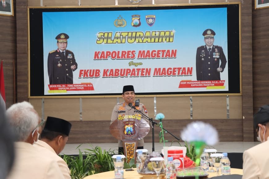 Kapolres Magetan AKBP Muhammad Ridwan SIK MSi saat membuka pertemuan silaturahmi mengucapkan selamat datang dan berterima kasih atas peran FKUB sebagai penggerak kerukunan dan toleransi umat beragama.