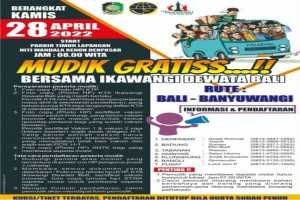 “Kami bersama Ikawangi memberikan fasilitas mudik lebaran gratis bagi warga Banyuwangi yang tinggal atau bekerja di Bali. Pemberangkatan akan dilaksanakan Kamis, 28 April. Kegiatan mudik gratis ini bekerjasama dengan Ikawangi Dewata,” kata Pelaksana Tugas (Plt) Kepala Dinas Perhubungan Dwi Yanto, Senin (18/4/2022).