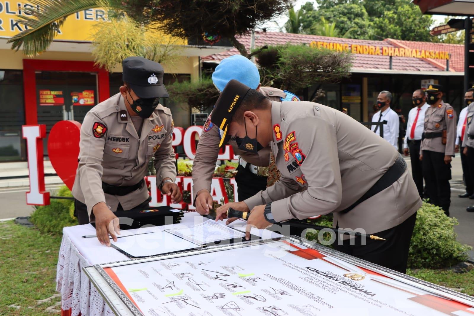 Peneguhan komitmen itu diwujudkan dalam penandatanganan komitmen Zona Integritas menuju WBBM pada apel pagi di halaman depan Mapolres Blitar Kota.